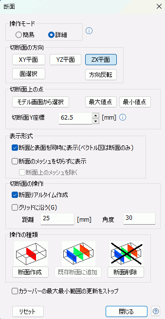 "断面のメッシュを切らずに表示"がON、"断面リアルタイム作成"ONの時は操作できません。