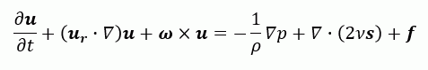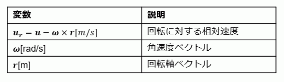 回転流れを考慮したい解析(MRF)では、1.層流、2.乱流で示した方程式を静止領域で解き、回転領域では以下の式を解いています。