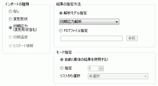 ・結果インポートタブ 結果の指定方法:解析モデル指定:解析①の解析モデル名を選択 l※応力解析タブで初期応力にチェックしている場合、インポートの種類は自動的に初期応力になります。