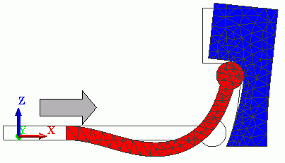 半円状の赤いボディが長方形状の青いボディに押し付けられ接触境界面が大きく変形しています。