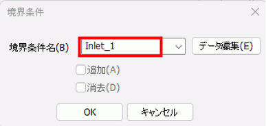[境界条件の編集]ダイアログにおいて、流入流速が1[m/s]となるように設定します。
