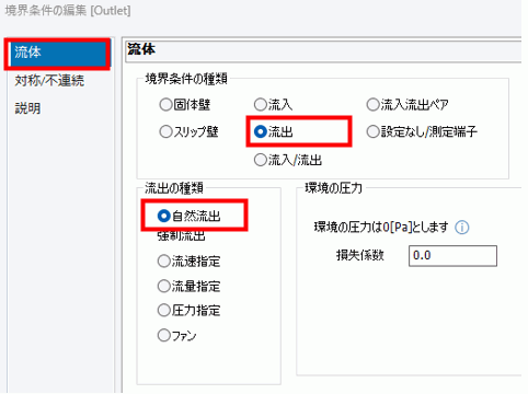 流体入口に強制流入(流速)、出口に自然流出を設定します。