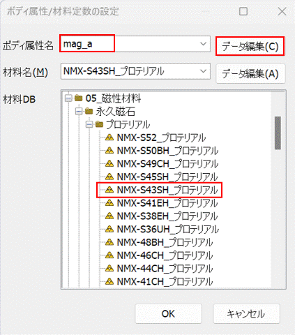 を入力し、次に材料DBの05_磁性材料-永久磁石-プロテリアルからNMX-S43SHをクリックします。